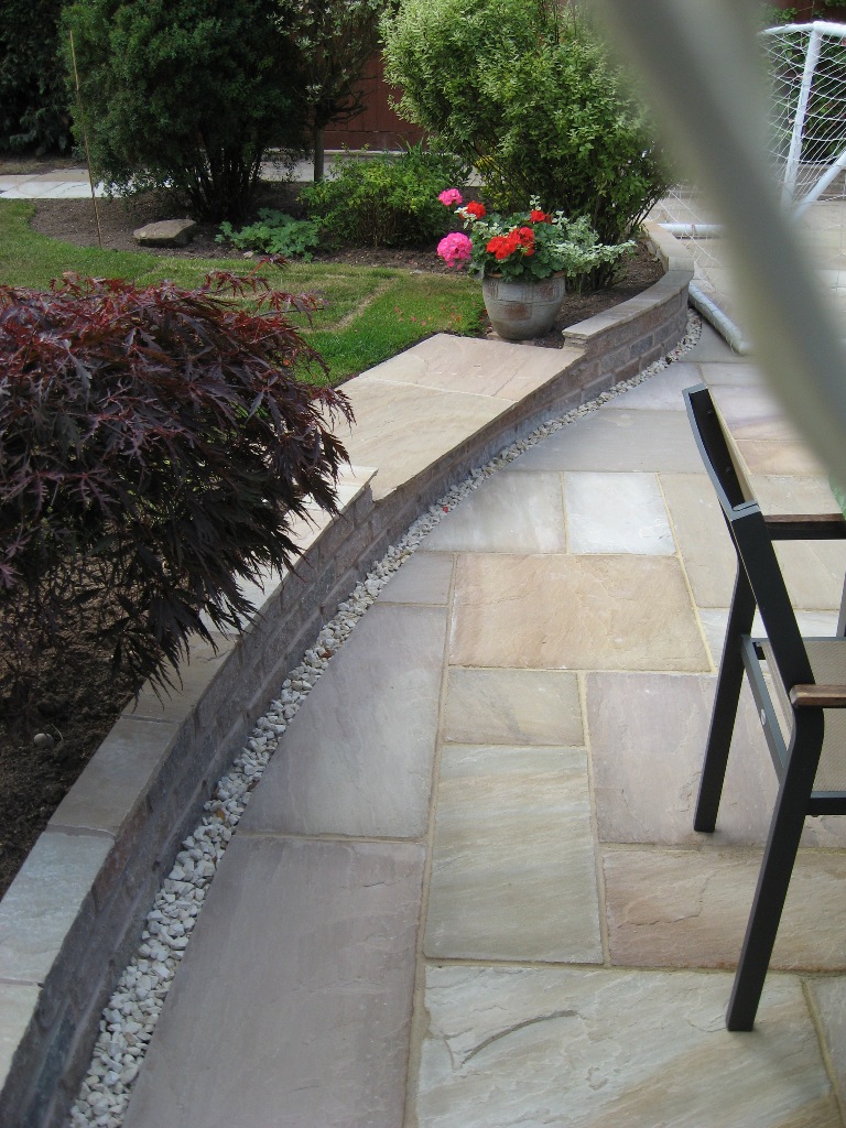 Landscaping in Kenilworth featuring new lawn, retaining wall and new patio extension.