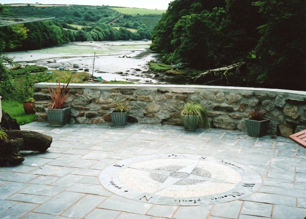 Extensive landscaping in Cornwall which included granite curved walls, slate paving incorporating water jet cut slate mosaic feature.
