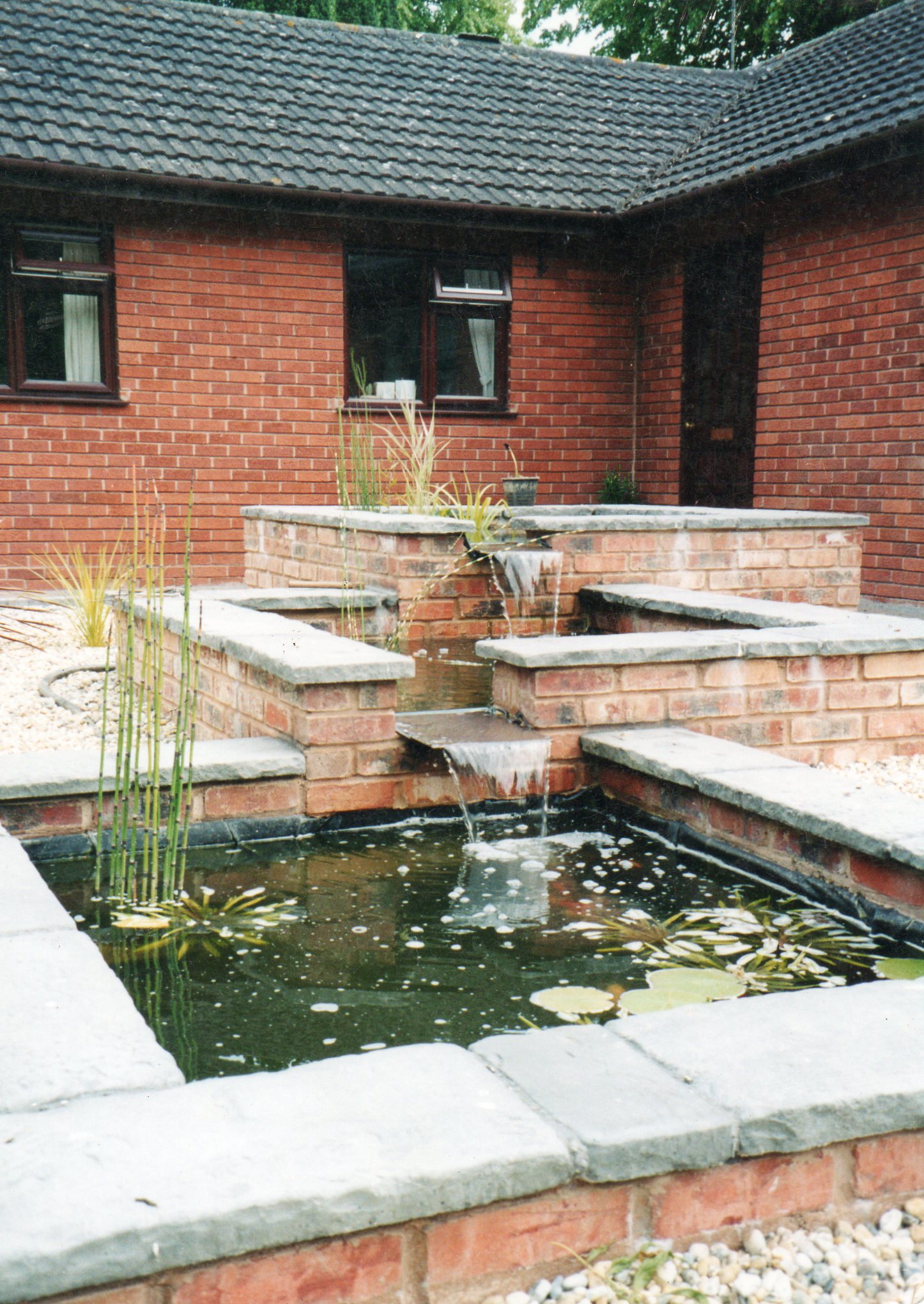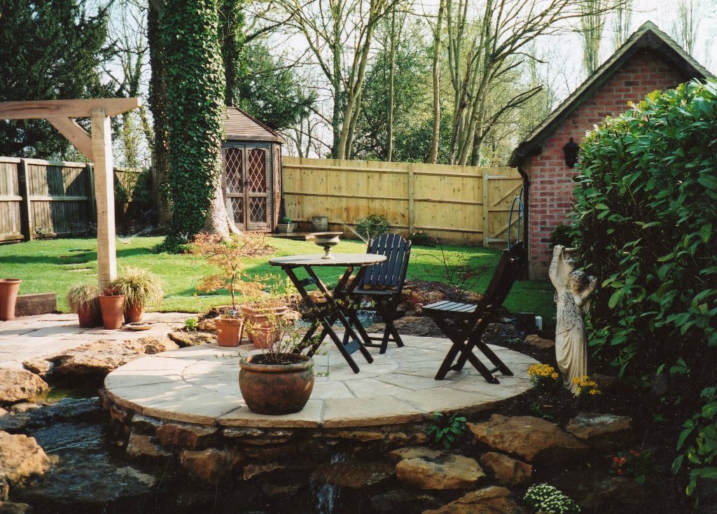 Extensive landscaping in Stoneleigh Abbey Cottage garden, features split level patio, oak pergola, integrated rock water feature with stream and stone bridge.