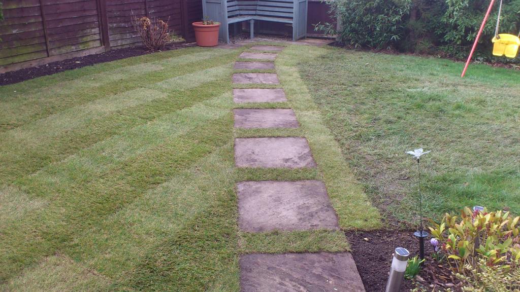 For this job in Kenilworth we prepared the ground and laid a new block paved path, rotivated the old lawn and re turfed and also installed a set of stone steps.