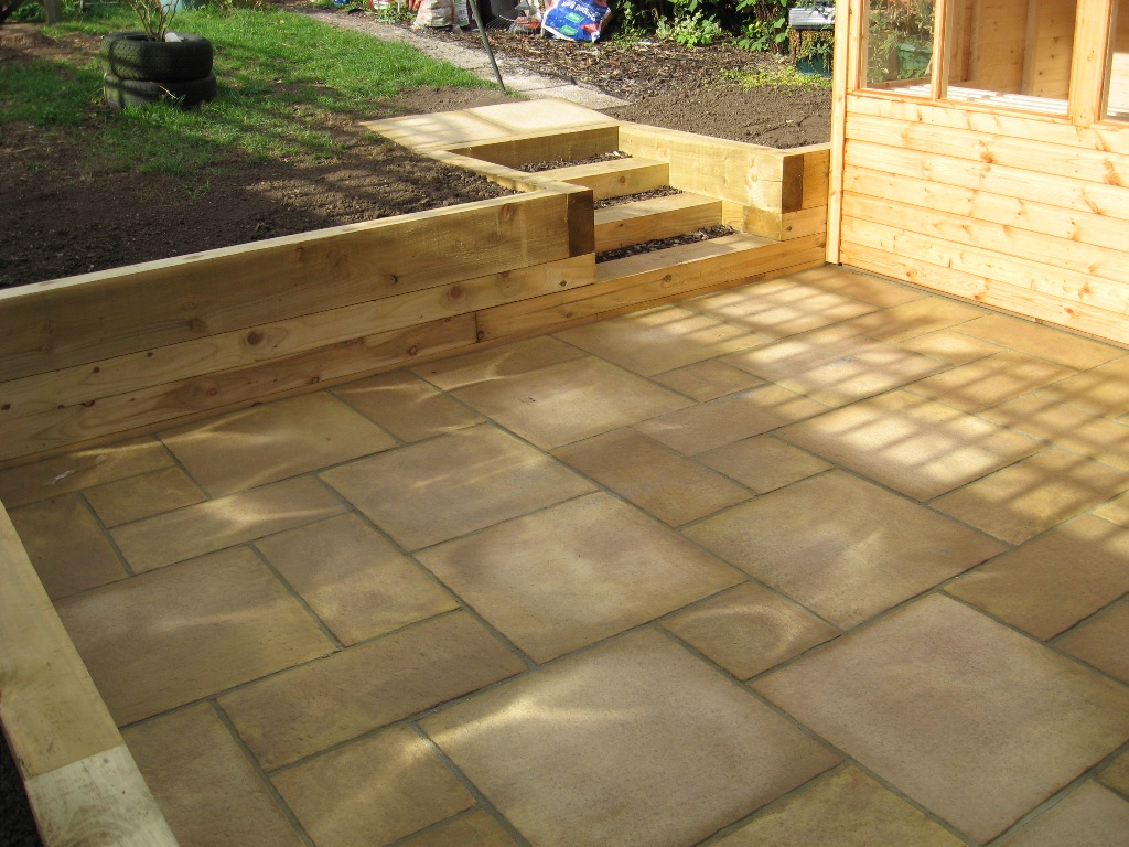 In this garden in Leamington Spa we extended the existing patio, installed sleeper retaining wall and steps.